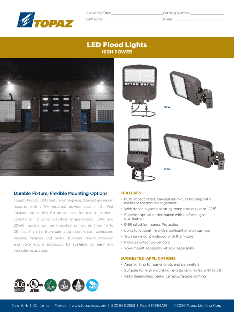 HIGH POWER150W300WDurable Fixture, Flexible Mounting OptionsFEATURESTopazs Floodlights feature a one piece, die-cast aluminumIK09