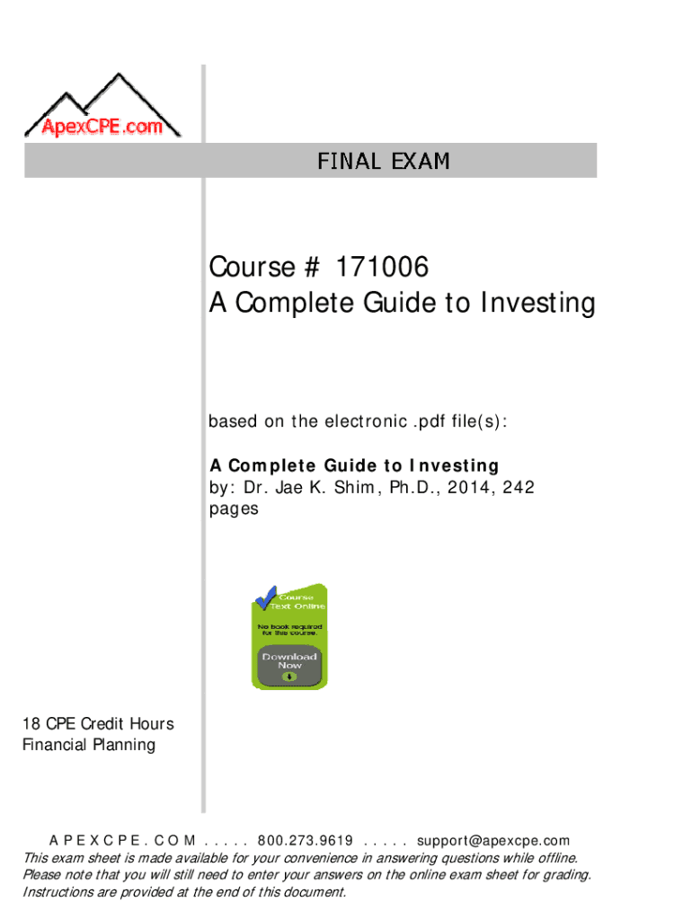 Course # 171006 A Complete Guide to Investing based on the electronic .pdf file(s): A Complete Guide to Investing by: Dr. Joe K. Shim, Ph.D., 2014, 242 pages18 CPE Credit Hours Financial Planning