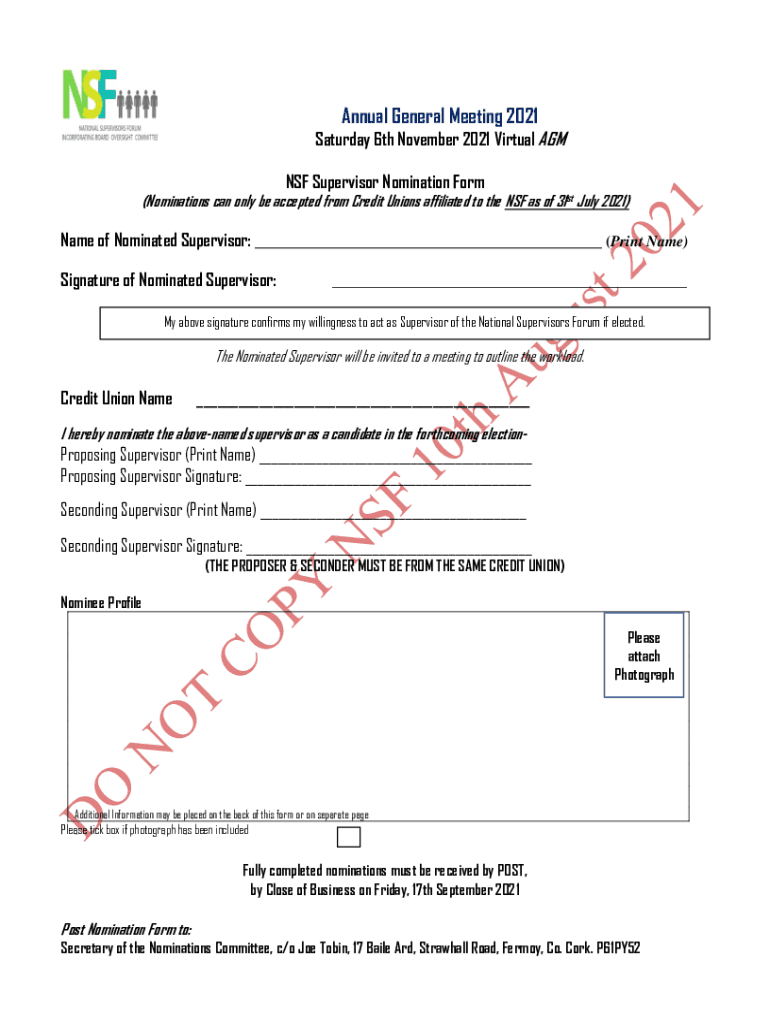 Annual General Meeting 2021Saturday 6th November 2021 Virtual AGM NSF Supervisor Nomination Form(Nominations can only be accepted from Credit Unions affiliated to the NSF as of 31st July 2021)Name