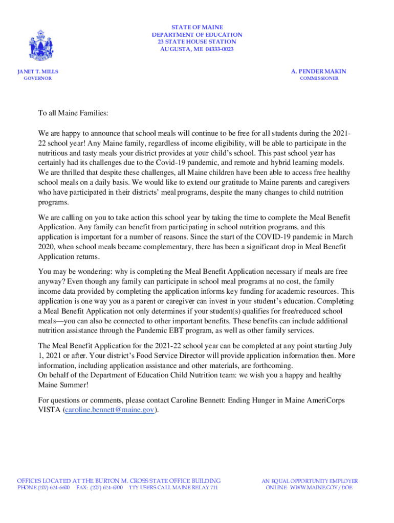 STATE OF MAINE DEPARTMENT OF EDUCATION 23 STATE HOUSE STATION AUGUSTA, ME 043330023JANET T. MILLS. GENDER MAKINGOVERNORCOMMISSIONERTo all Maine Families: We are happy to announce that school meals