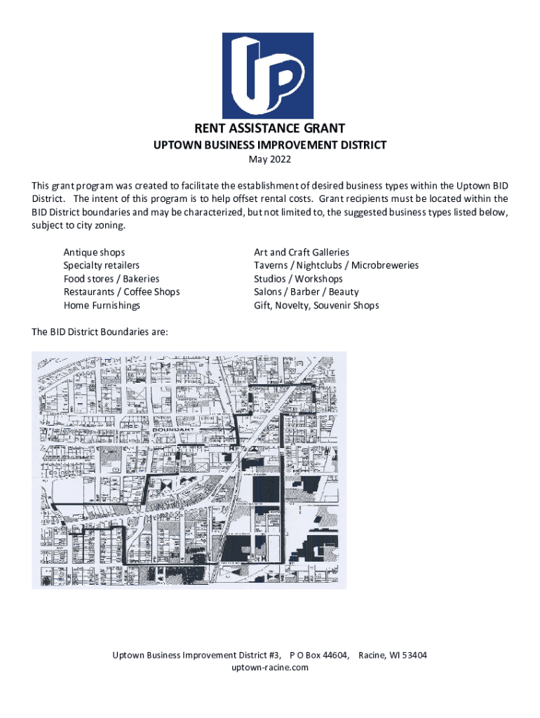 RENT ASSISTANCE GRANTUPTOWN BUSINESS IMPROVEMENT DISTRICT May 2022This grant program was created to facilitate the establishment of desired business types within the Uptown BID District. The intent