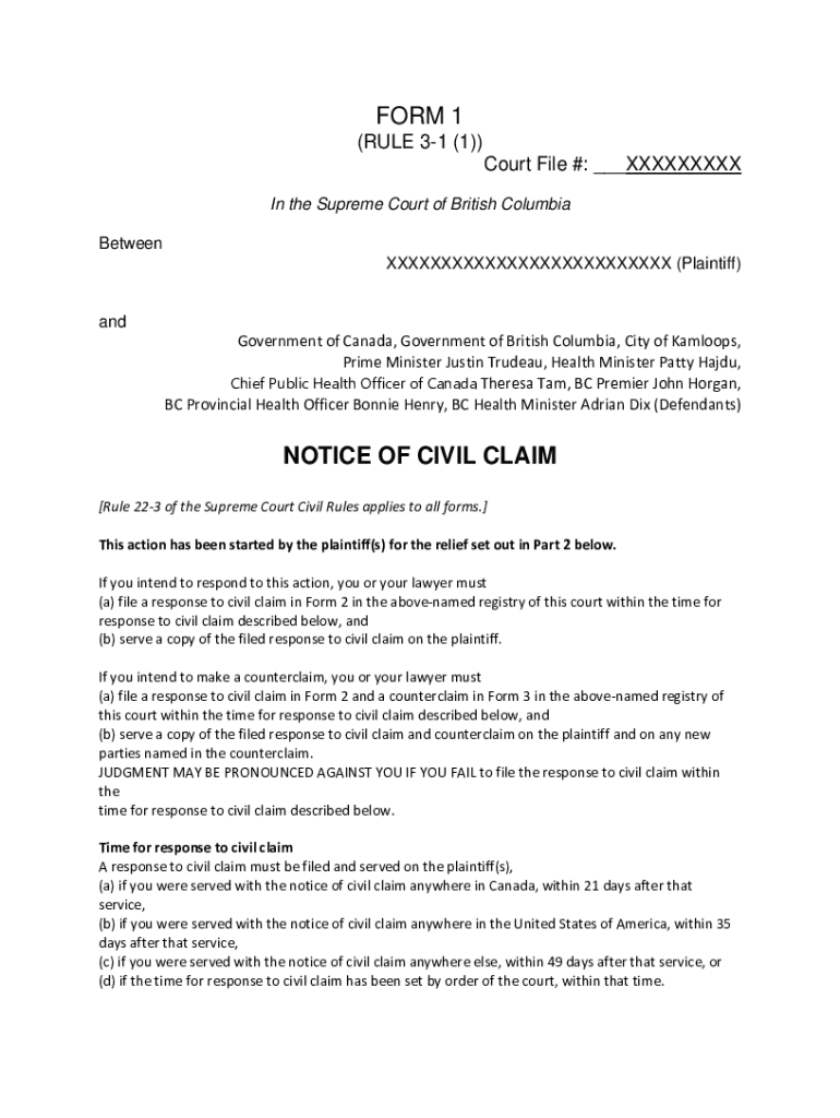 Get the free FORM 1 NOTICE OF CIVIL CLAIM - Canuck Law