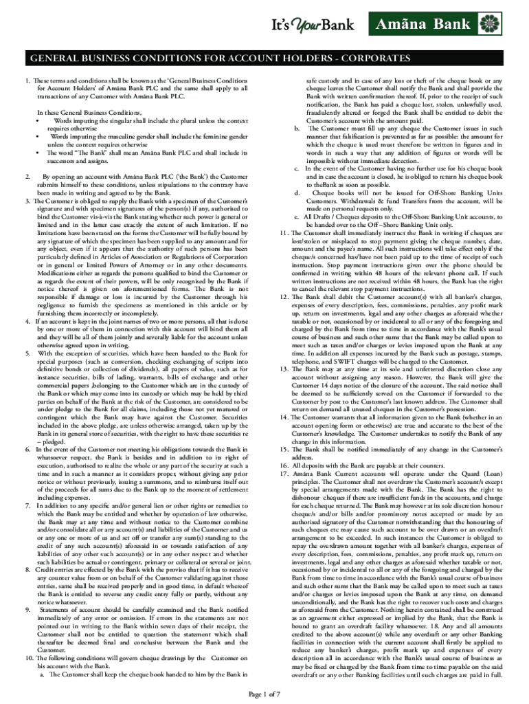 GENERAL BUSINESS CONDITIONS FOR ACCOUNT HOLDERS CORPORATES 1. These terms and conditions shall be known as the General Business Conditions for Account Holders of Anna Bank PLC and the same shall apply