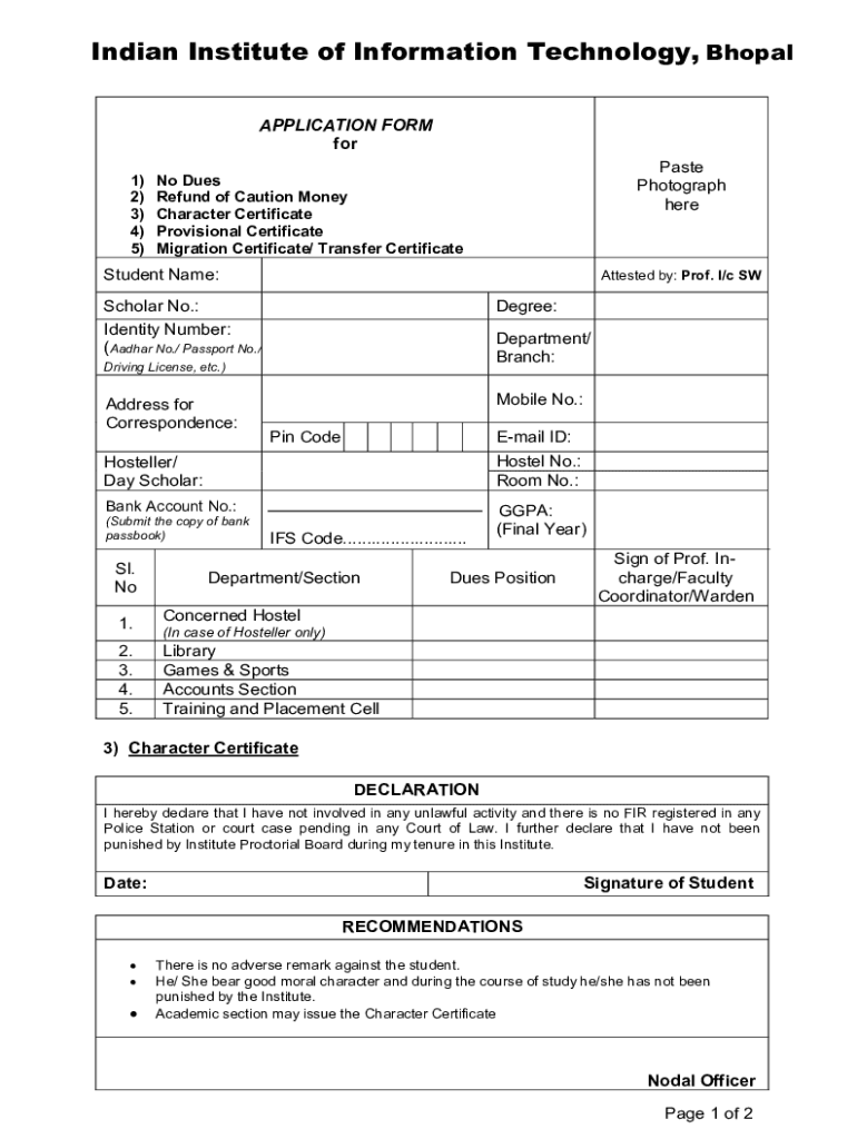 Indian Institute of Information Technology, Bhopal APPLICATION FORM for 1) 2) 3) 4) 5)Paste Photograph Herero Dues Refund of Caution Money Character Certificate Provisional Certificate Migration Certificate/