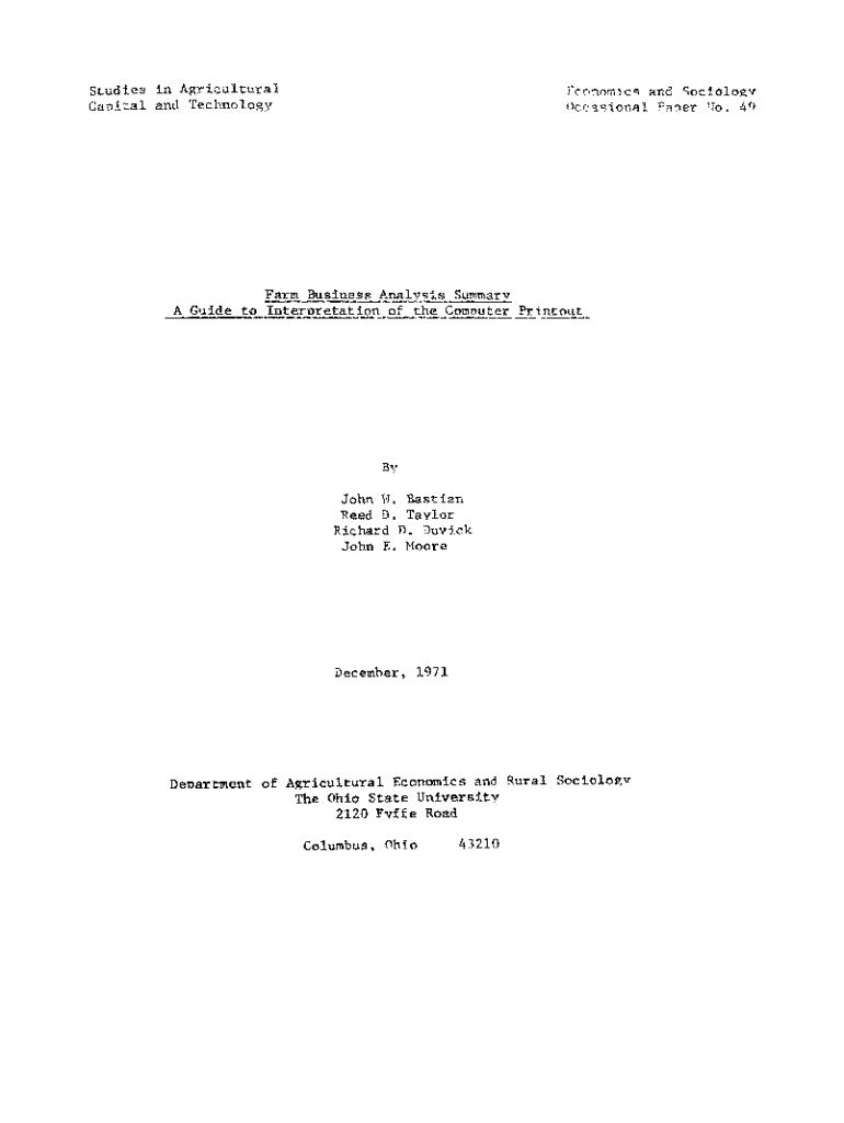 Studies in Agricultural Capital and Technologyfconom1cc; and Sociology NCC\” LC.;tonal Prier ! Jo. 40Farm Business Analysis Summary A Guide to Interpretation of the Computer i. Coulby John W. Bastian