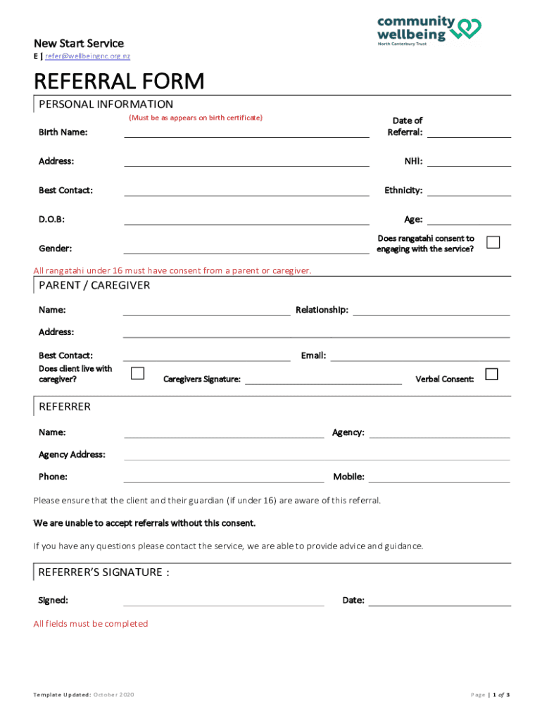 New Start Service E | refer@wellbeingnc.org.nzREFERRAL FORM PERSONAL INFORMATION (Must be as appears on birth certificate)Date of Referral:Birth Name: Address:NHS:Best Contact:Ethnicity:D.O.B:Age:Gender:Does