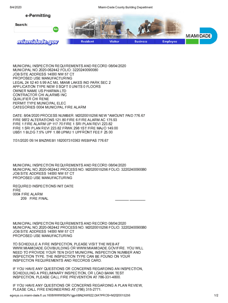 8/4/2020MiamiDade County Building DepartmentePermitting Search:MUNICIPAL INSPECTION REQUIREMENTS AND RECORD 08/04/2020 MUNICIPAL NO.2020062442 FOLIO: 3220240090080 JOB SITE ADDRESS 14000 NW 57 CT