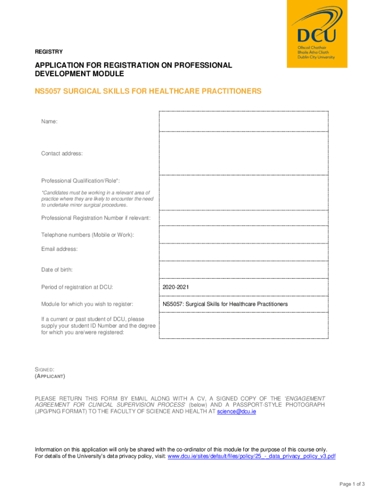 REGISTRYAPPLICATION FOR REGISTRATION ON PROFESSIONAL DEVELOPMENT MODULE NS5057 SURGICAL SKILLS FOR HEALTHCARE PRACTITIONERSName:Contact address:Professional Qualification/Role*: *Candidates must be