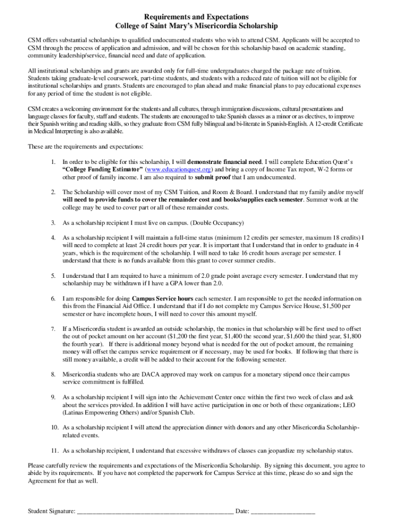 Requirements and Expectations College of Saint Mary's Misericordia Scholarship CSM offers substantial scholarships to qualified undocumented students who wish to attend CSM. Applicants will be accepted