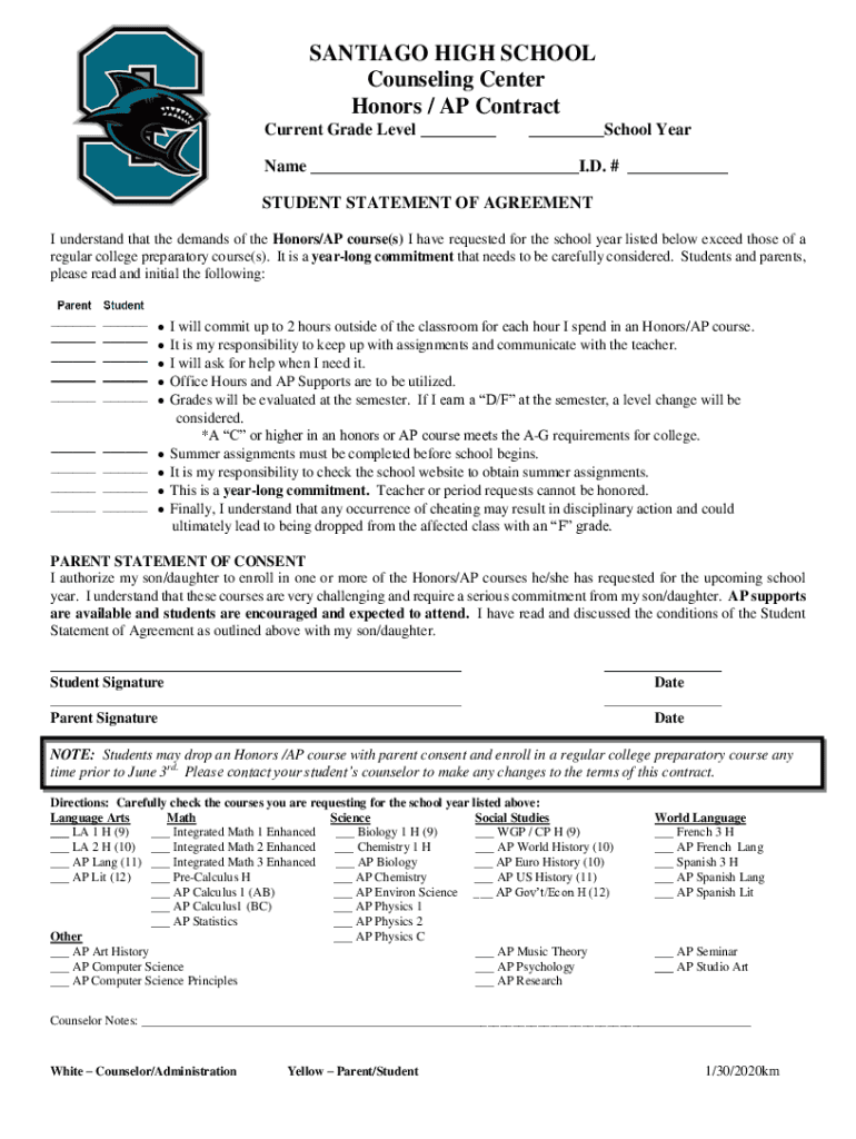 SANTIAGO HIGH SCHOOL Counseling Center Honors / AP Contract Current Grade Level ______School Rename ___I. D. # ___ STUDENT STATEMENT OF AGREEMENT I understand that the demands of the Honors/AP course(s)