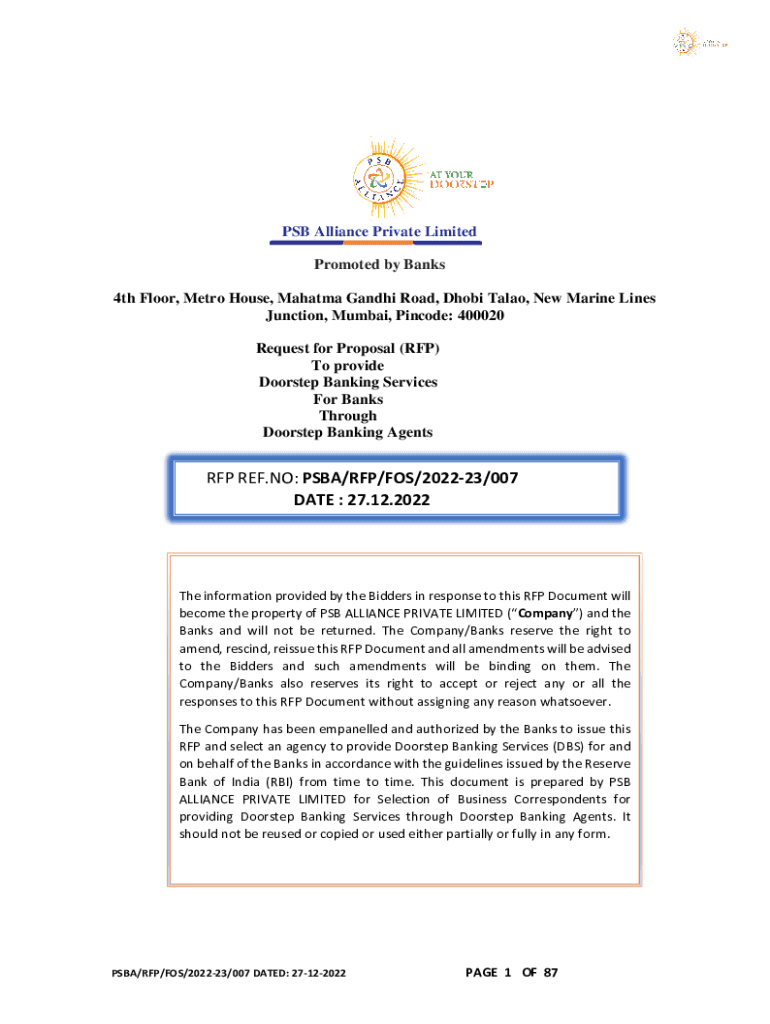 PSB Alliance Private Limited Promoted by Banks 4th Floor, Metro House, Mahatma Gandhi Road, Dhoti Also, New Marine Lines Junction, Mumbai, Pin code: 400020 Request for Proposal (RFP) To provide Doorstep