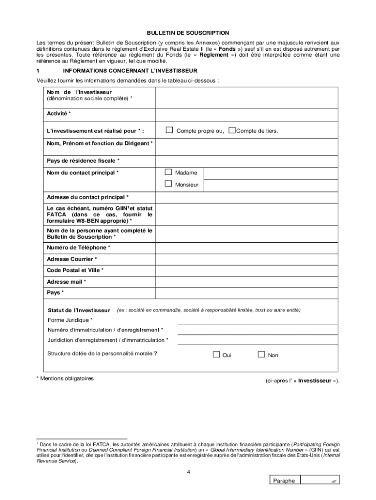 Get the free Bulletin de Souscription Exclusive Real Estate II - Intencial