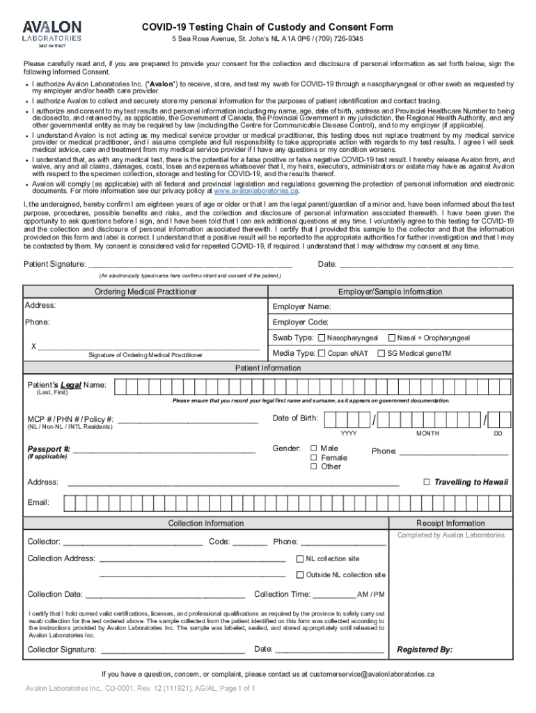 COVID-19 Testing Chain of Custody and Consent Form 5 Sea Rose Avenue, St. Johns NL A1A 0P6 / (709) 7269345Please carefully read and, if you are prepared to provide your consent for the collection