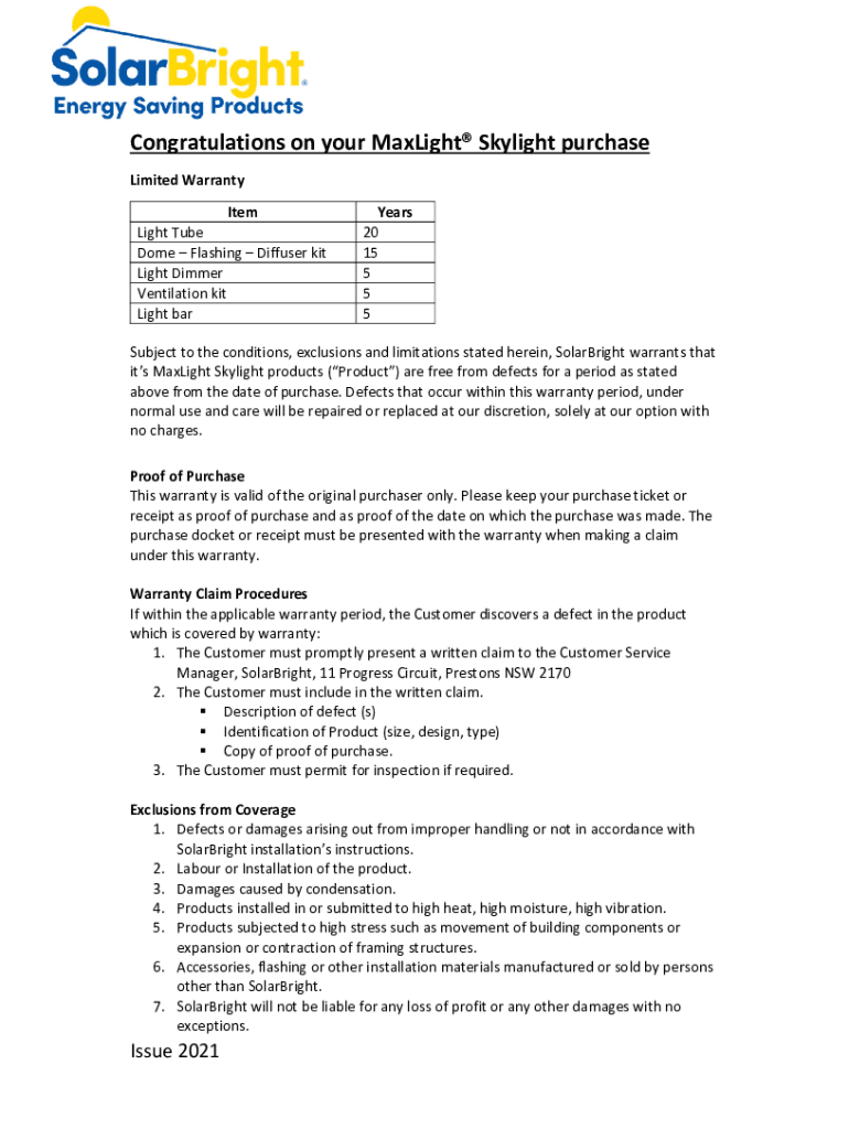 Congratulations on your Daylight Skylight purchase Limited Warranty Item Light Tube Dome Flashing Diffuser kit Light Dimmer Ventilation kit Light barriers 20 15 5 5 5Subject to the conditions, exclusions