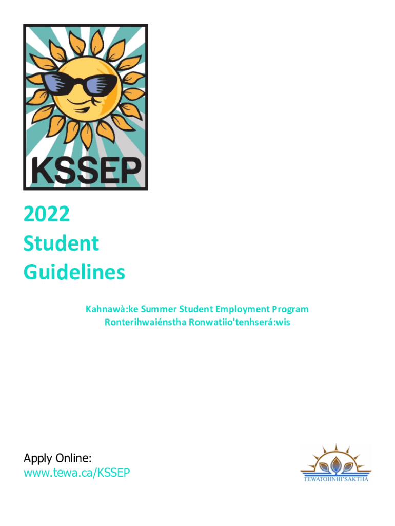 2022 Student Guidelines Kana:KE Summer Student Employment Program Ronterihwainstha Ronwatiio\'tenser:misapply Online: www.tewa.ca/KSSEPTABLE OF CONTENTS1.0 PROGRAM OBJECTIVE22.0 PROGRAM MANAGER23.0