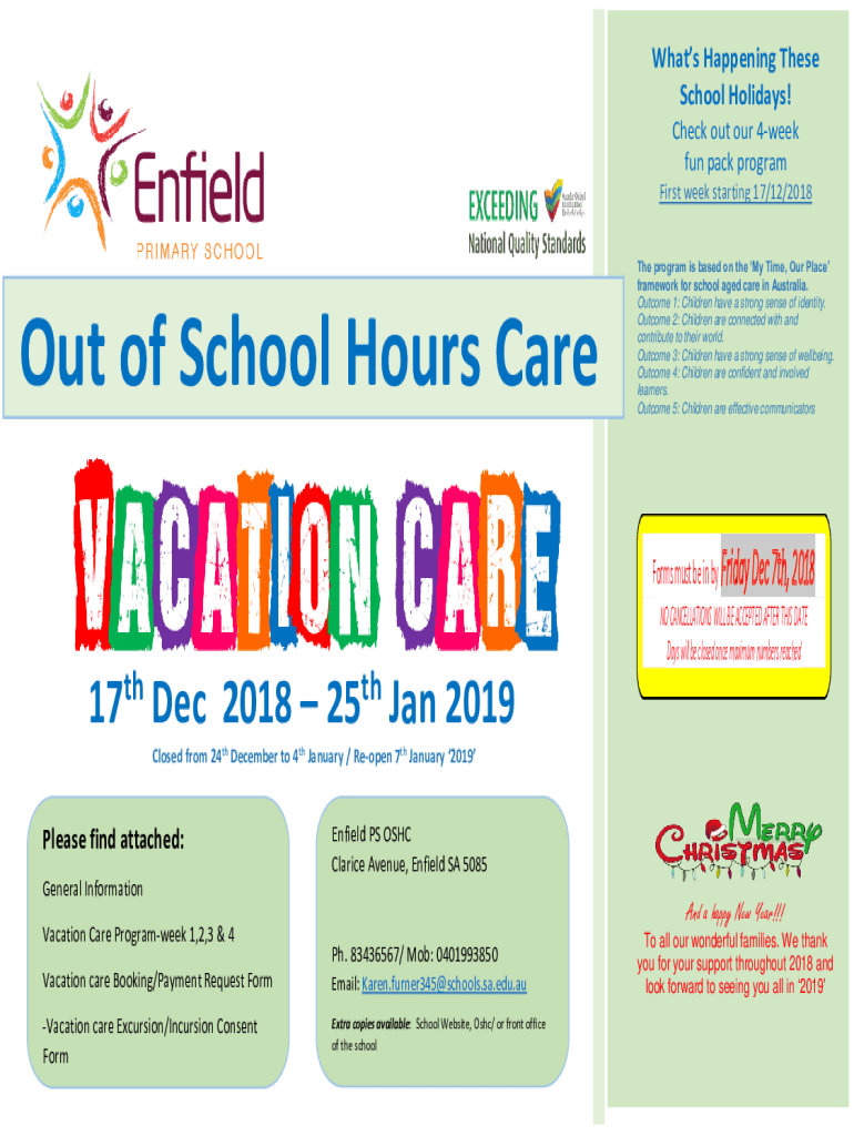 What's Happening These School Holidays! Check out our 4week fun pack program First week starting 17/12/2018Out of School Hours Care The programs is based on the Time, Our Place framework for school