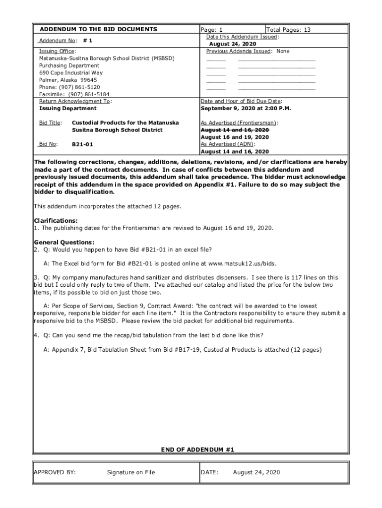 ADDENDUM TO THE BID DOCUMENTS Addendum No:Page: 1#1Issuing Office: MatanuskaSusitna Borough School District (MS BSD) Purchasing Department 690 Cope Industrial Way Palmer, Alaska 99645 Phone: (907)