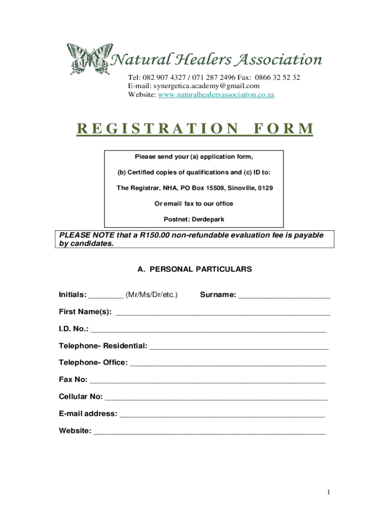 Tel: 082 907 4327 / 071 287 2496 Fax: 0866 32 52 32 Email: synergetica.academy@gmail.com Website: www.naturalhealersassociation.co.zaR E GI ST RATE O N FO R M Please send your (a) application form,