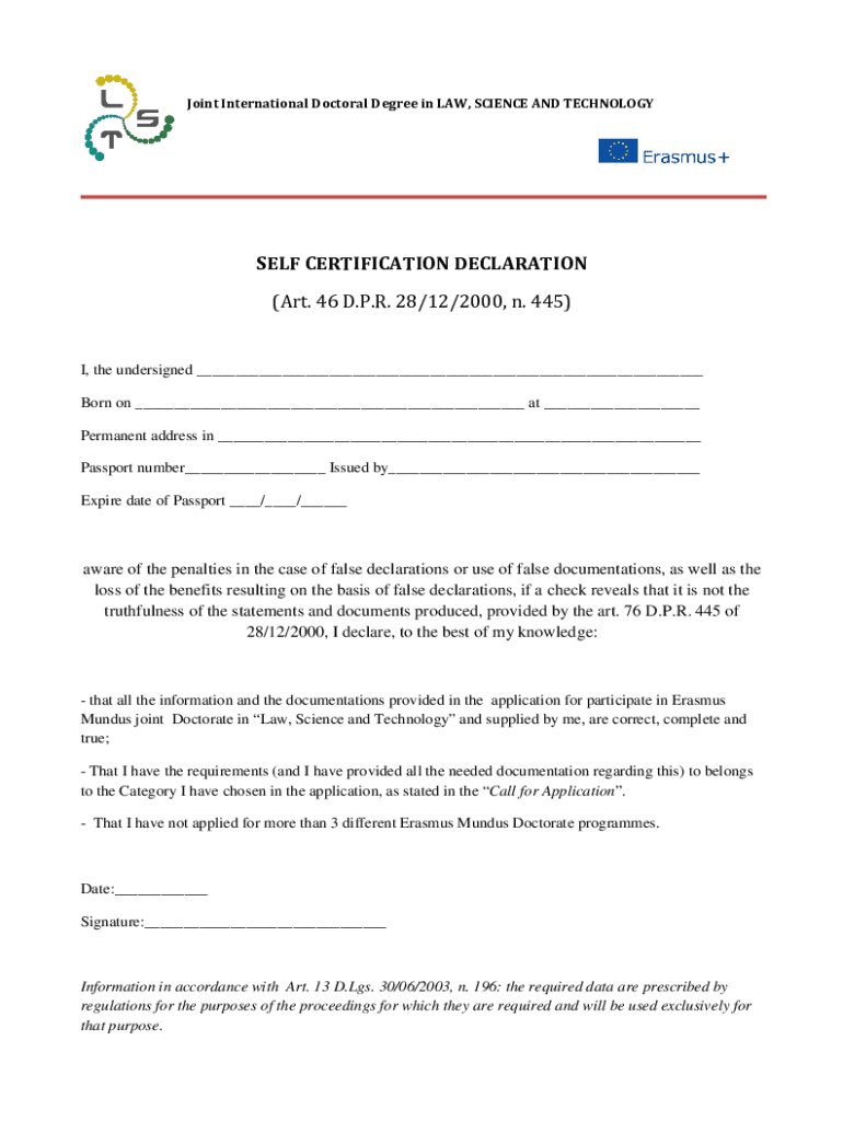 Joint International Doctoral Degree in LAW, SCIENCE AND TECHNOLOGYSELF CERTIFICATION DECLARATION (Art. 46 D.P.R. 28/12/2000, n. 445)I, the undersigned ___ Born on ___ at ___ Permanent address in ___