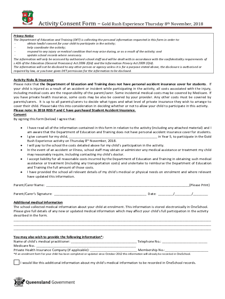 Activity Consent Form Gold Rush Experience Thursday 8th November 2018 Privacy Notice The Department of Education and Training (DET) is collecting the personal information requested in this form in