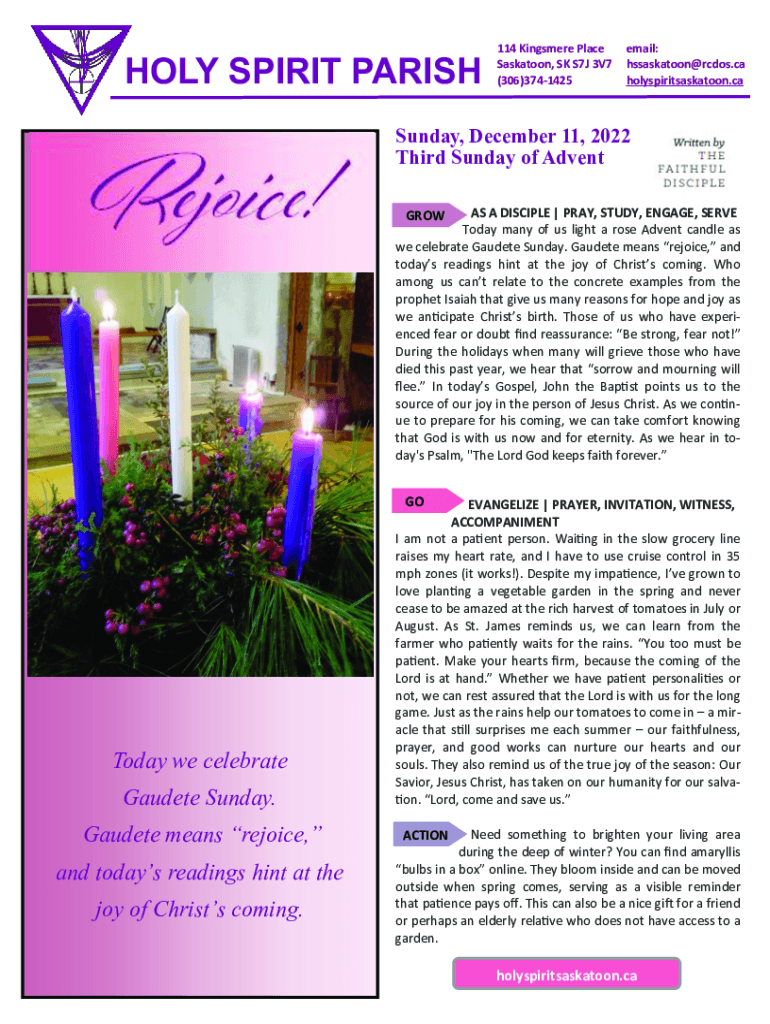 HOLY SPIRIT PARISH114 Kings mere Place Saskatoon, SK S7J 3V7 (306)3741425email: hssaskatoon@rcdos.ca holyspiritsaskatoon.ca Sunday, December 11, 2022, Third Sunday of Advent AS A DISCIPLE | PRAY,