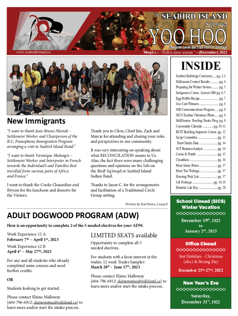 The SEABIRDISLANDSqwqelYOO Because news isn't all bad or boring! MOQ:s Fallen snow season (December) 2022www. Seabird island.caINSIDENew Immigrants I want to thank Jean Bruno Non Settlement Worker