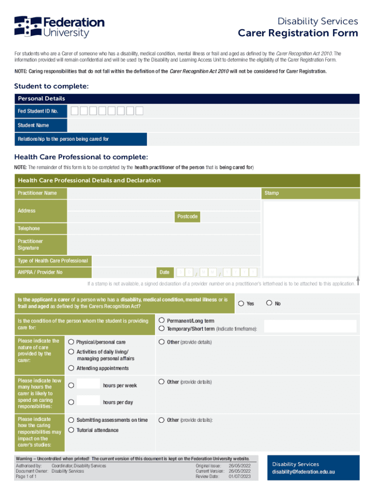 Get the free Disability Support Services Carer Registration Form