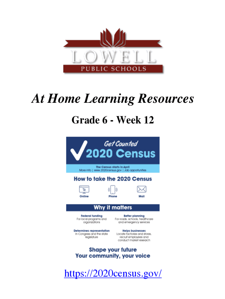 At Home Learning Resources Grade 6 Week 12https://2020census.gov/Grade 6 ELA Week 12All previous activities, as well as other resources can be found on the Lowell Public Schools website:https://www.lowell.k12.ma.us/Page/3802This
