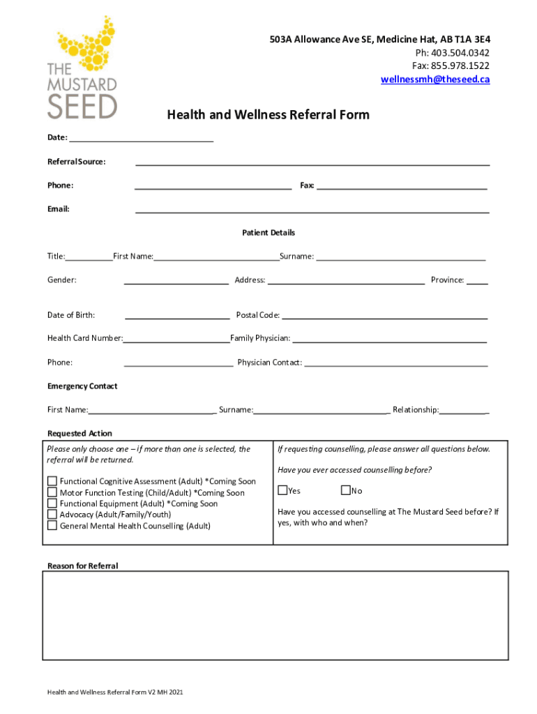 503A Allowance Ave SE, Medicine Hat, AB T1A 3E4 pH: 403.504.0342 Fax: 855.978.1522 wellnessmh@theseed.caHealth and Wellness Referral Form Date: Referral Source: Phone:Fax:Email: Patient Details Title:First