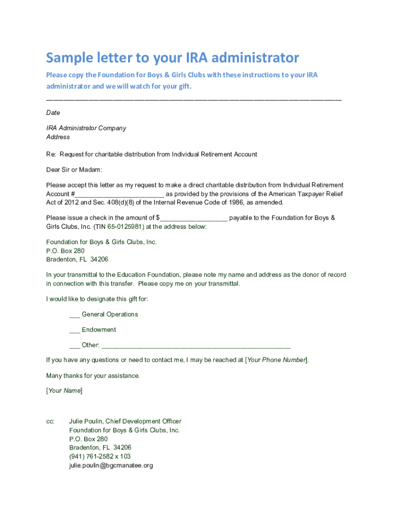 Sample letter to your IRA administrator Please copy the Foundation for Boys & Girls Clubs with these instructions to your IRA administrator, and we will watch for your gift. ___ Date IRA Administrator