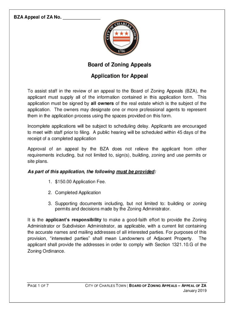 BZA Appeal of ZA No. ___Board of Zoning Appeals Application for Appeal To assist staff in the review of an appeal to the Board of Zoning Appeals (BZA), the applicant must supply all the information