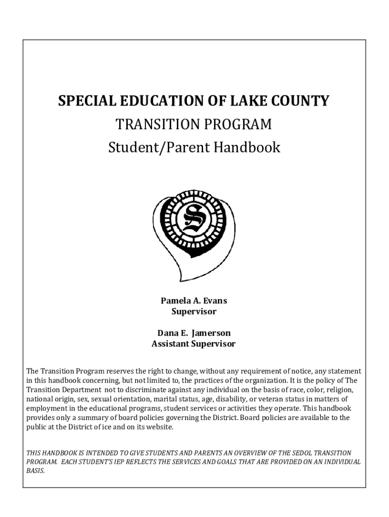 SPECIALEDUCATIONOFLAKECOUNTY TRANSITIONPROGRAM Student/ParentHandbook Pamela. Evans Supervisor. Danae. Jameson AssistantSupervisor. TheTransitionProgramreservestherighttochange, withoutanyrequirementofnotice,