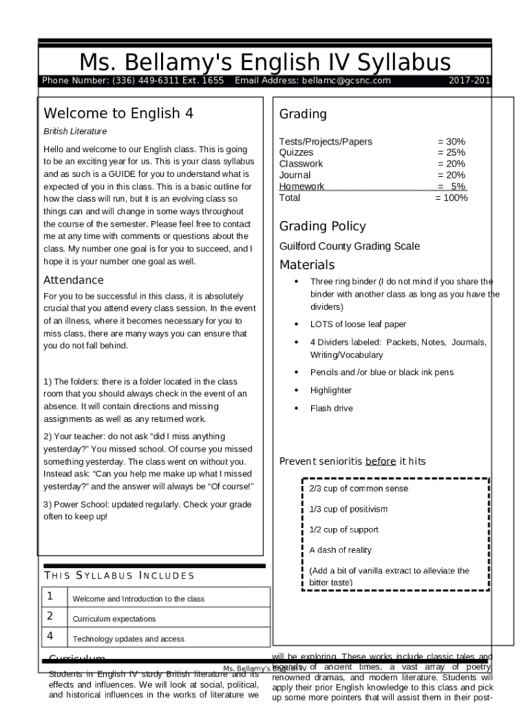 What is Welcome to English 4 - Guilford County Schools Form?