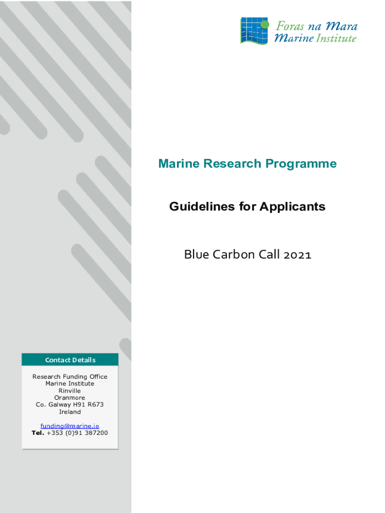 Marine Research Program Guidelines for ApplicantsBlue Carbon Call 2021Contact Details Research Funding Office Marine Institute Linville Oran more Co. Galway H91 R673 Ireland funding@marine.ie Tel.