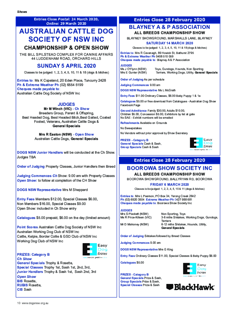 ShowsEntries Close Postal: 24 March 2020, Entries Close 7 April 2019 Online: 29 March 2020AUSTRALIAN CATTLE DOG SOCIETY OF NSW INC CHAMPIONSHIP & OPEN SOOTHE BILL INSTEAD COMPLEX FOR CANINE AFFAIRS