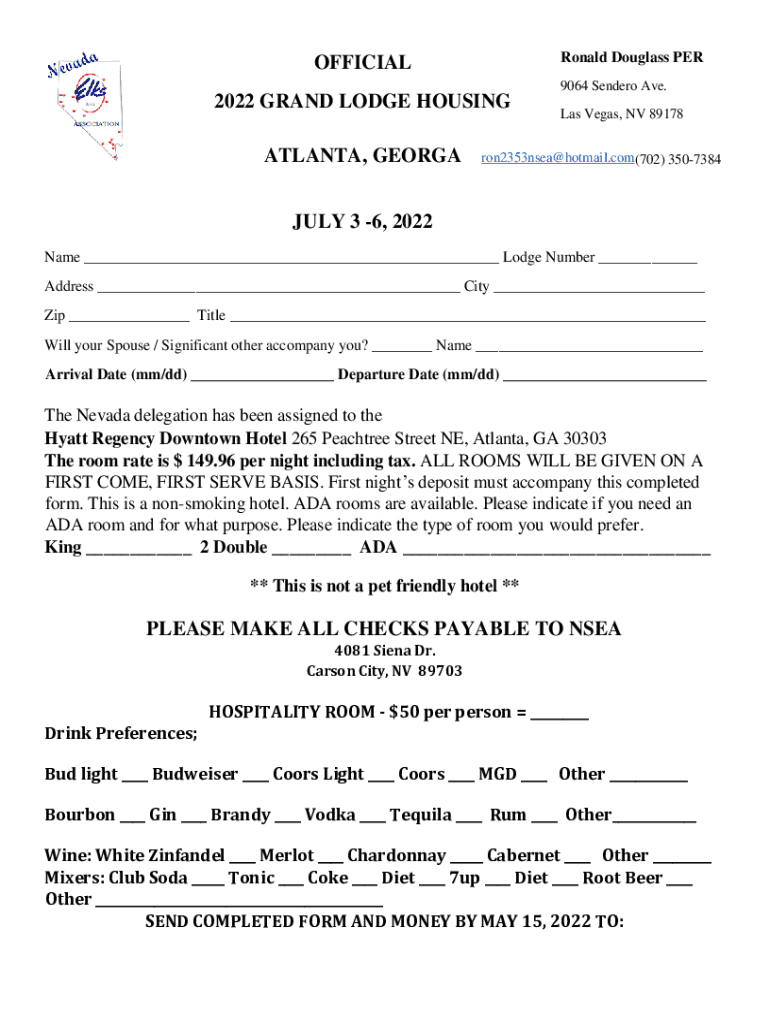 Reference: l58th Grand Lodge Convention Atlanta, GA July 3 6, 2022 Please respond by filling out the order blank for room reservations and returning the forms immediately. Please note; Make all checks
