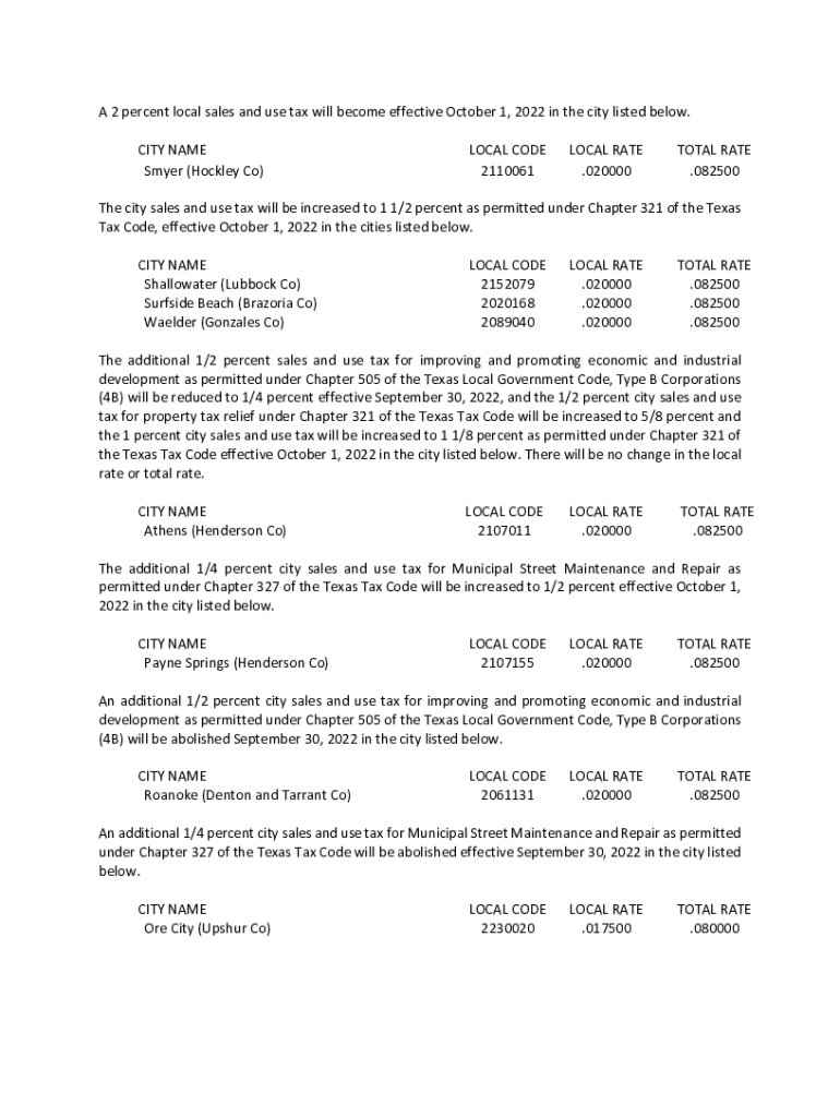 A 2 percent local sales and use tax will become effective October 1, 2023, in the city listed below. CITY NAME Shyer (Hockey Co)LOCAL CODE 2110061LOCAL RATE .020000TOTAL RATE .082500The city sales