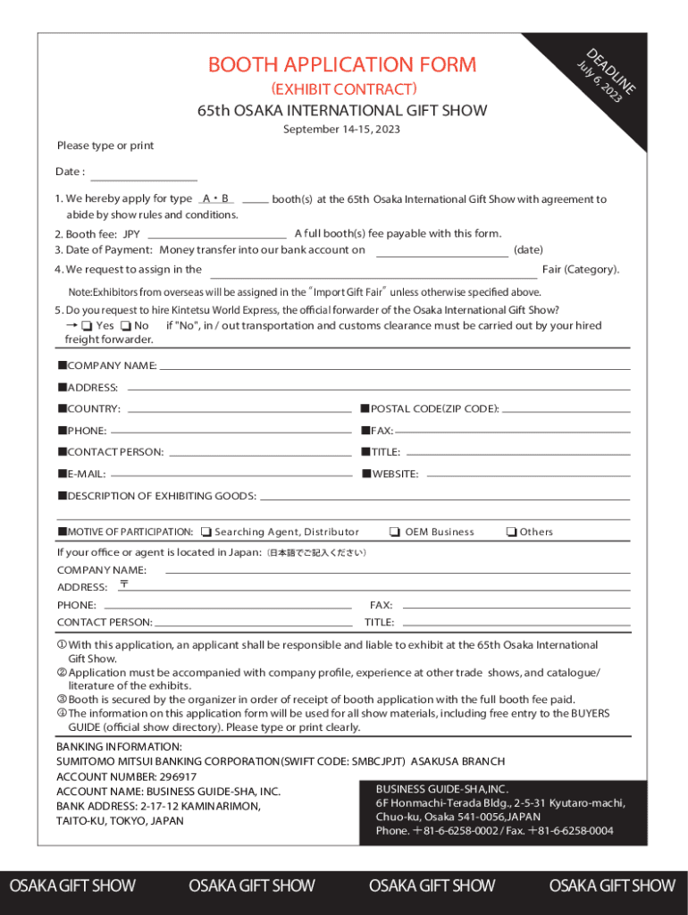 NE LI 0 2 3 AD, 2 DE July 6JBOOTH APPLICATION FORM (EXHIBIT CONTRACT) 65th OSAKA INTERNATIONAL GIFT SHOW September 1415, 2023 Please type or print Date : 1. We hereby apply for type A B abide by show