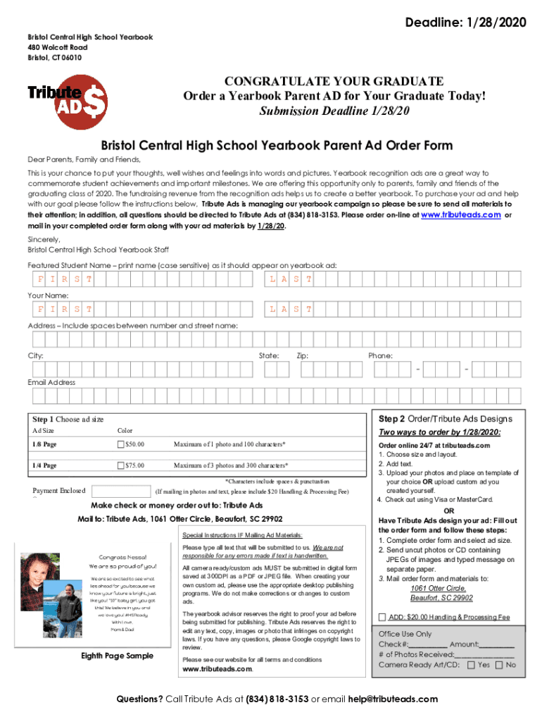 Deadline: 1/28/2020 Bristol Central High School Yearbook 480 Wolcott Road Bristol, CT 06010CONGRATULATE YOUR GRADUATE Order a Yearbook Parent AD for Your Graduate Today! Submission Deadline 1/28/20
