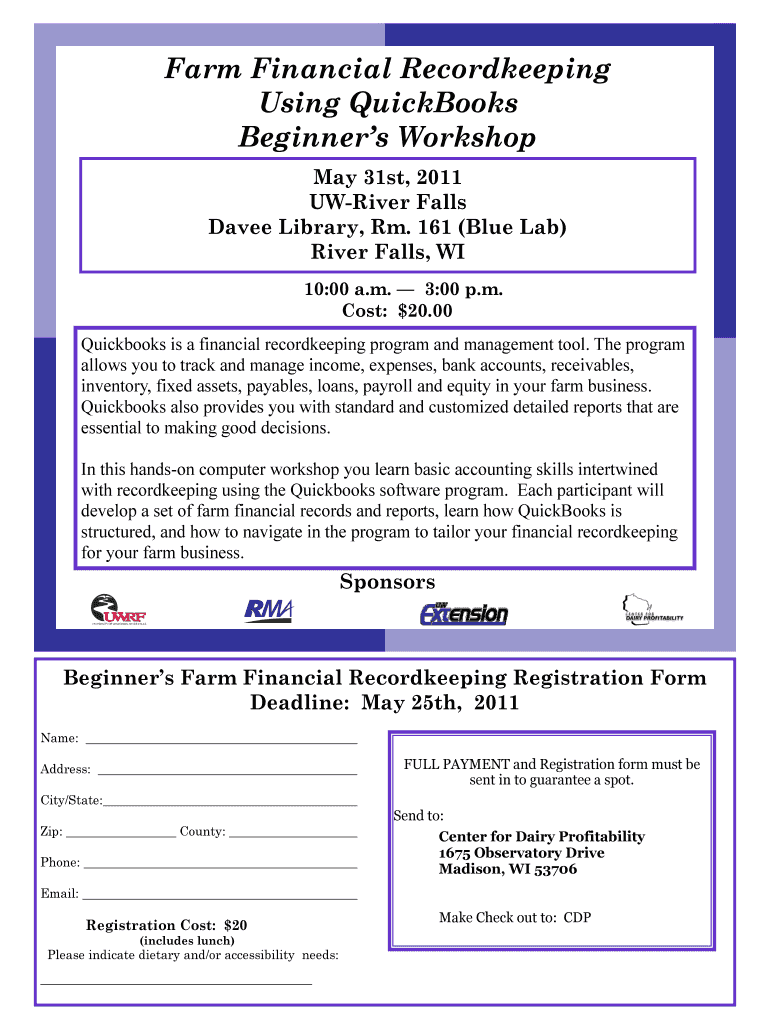 Farm Financial Record keeping Using QuickBooks Beginners Workshop May 31st, 2011 Upriver Falls Dave Library, Rm. 161 (Blue Lab) River Falls, WI 10:00 a.m. 3:00 p.m. Cost: $20.00 Quickbooks is a financial