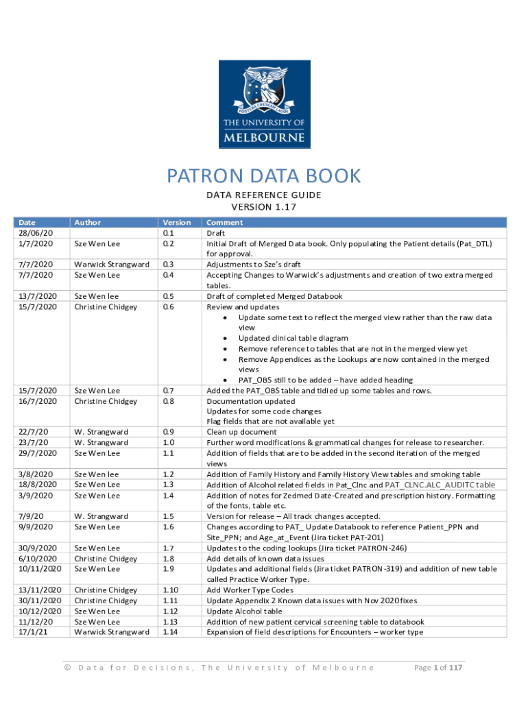 PATRON DATA BOOK DATA REFERENCE GUIDE VERSION 1.17 Date 28/06/20 1/7/2020Author She Wen Reversion 0.1 0.27/7/2020 7/7/2020Warwick Standard She Wen Lee0.3 0.413/7/2020 15/7/2020Sze Wen lee Christine