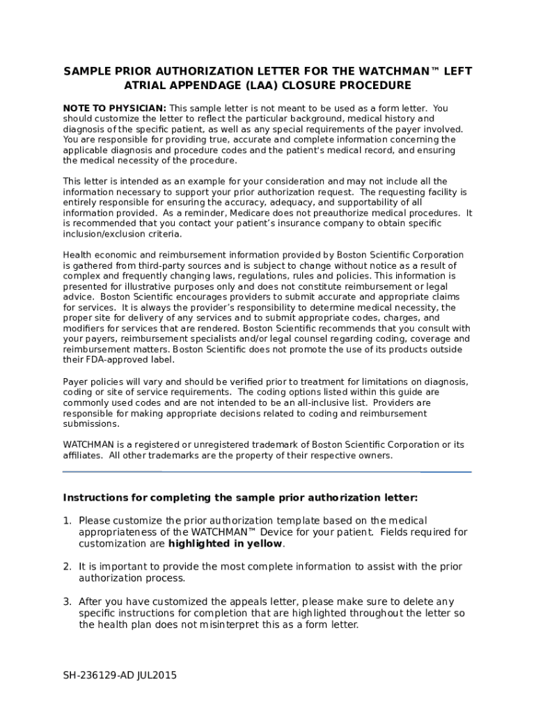 The Evaluation of the WATCHMAN Left Atrial Appendage (LAA ... is a Word document needed to be submitted to the required address in order to provide some information. It must be filled-out and signed, which may be done in hard copy, or with a certain software e. g. PDFfiller. This tool lets you fill out any PDF or Word document right in the web, customize it according to your requirements and put a legally-binding electronic signature. Right after completion, the user can easily send the Evaluation of the WATCHMAN Left Atrial Appendage (LAA ... to the appropriate recipient, or multiple recipients via email or fax. The editable template is printable as well due to PDFfiller feature and options presented for printing out adjustment. Both in electronic and in hard copy, your form should have a organized and professional outlook. You may also turn it into a template to use it later, so you don't need to create a new file over and over. All you need to do is to customize the ready form.