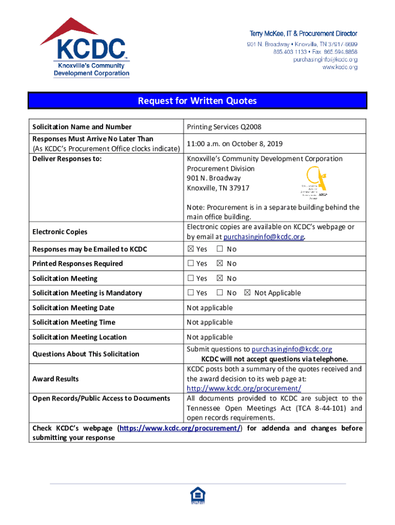 Request for Written Quotes Solicitation Name and NumberPrinting Services Q2008Responses Must Arrive No Later Than 11:00 a.m. on October 8, 2019 (As CDs Procurement Office clocks indicate) Deliver