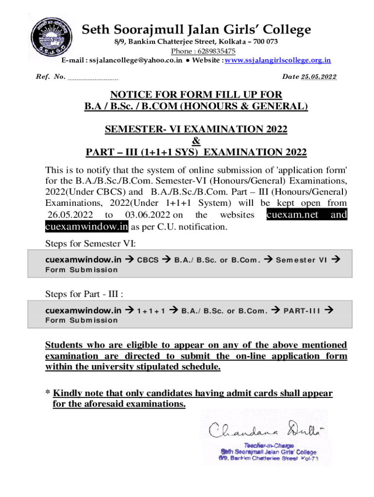 Seth Soorajmull Japan Girls College8/9, Bank Chatterjee Street, Kolkata 700 073 Phone : 6289835475 Email : ssjalancollege@yahoo.co.in Website : www.ssjalangirlscollege.org.in Ref. No. Date 25.05.2022NOTICE