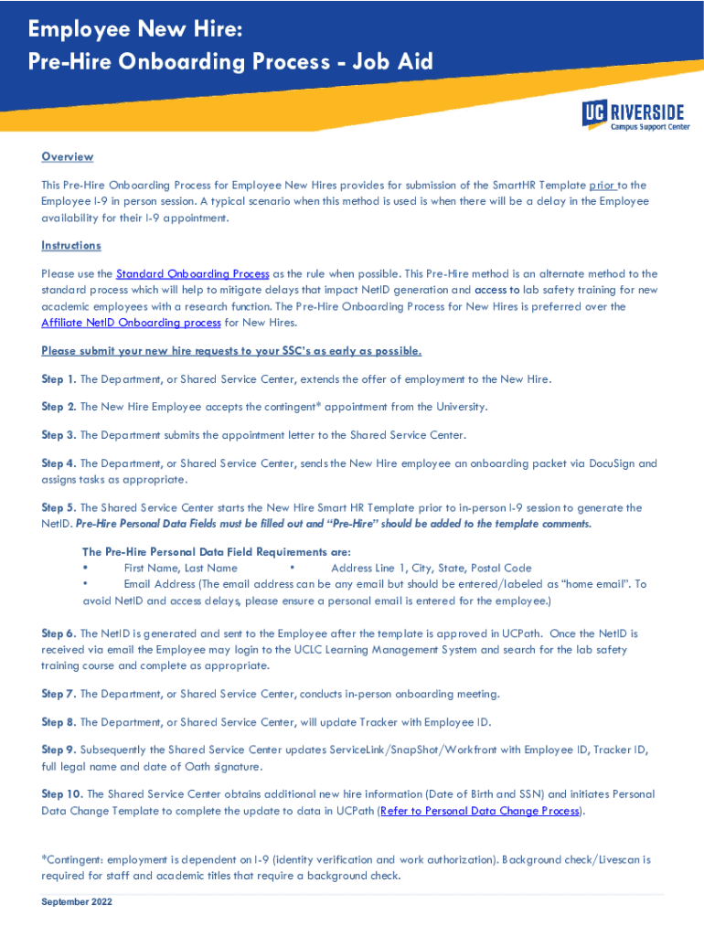 Employee New Hire: Rehire Onboarding Process Job Overview This Rehire Onboarding Process for Employee New Hires provides for submission of the Smarter Template prior to the Employee I9 in person session.