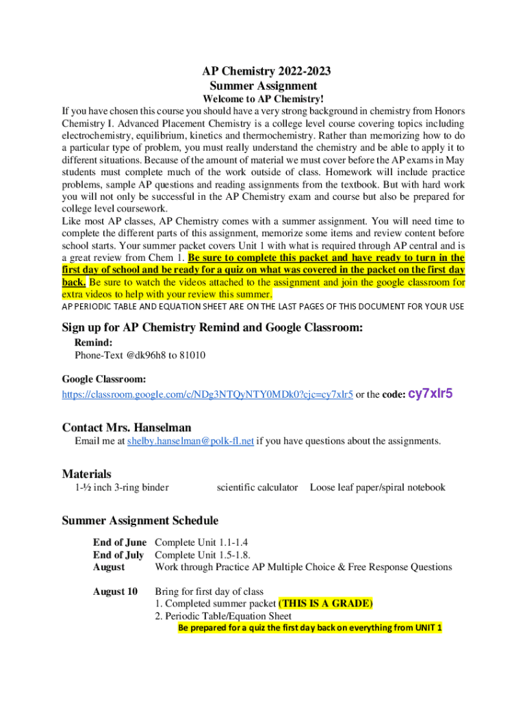 Get the free AP Chemistry Summer Assignment - SharpSchool