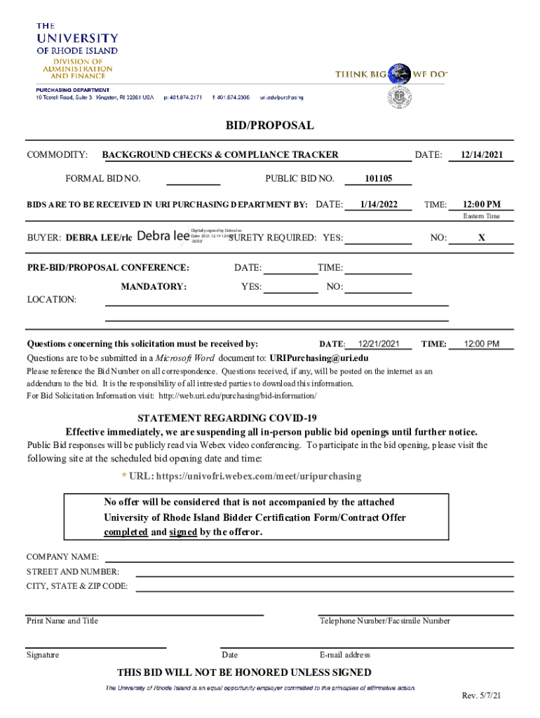 BID/PROPOSAL COMMODITY:BACKGROUND CHECKS & COMPLIANCE TRACKERFORMAL BID NO.DATE:PUBLIC BID NO.BIDS ARE TO BE RECEIVED IN URI PURCHASING DEPARTMENT BY: DATE:12/14/2021101105 1/14/2022TIME:12:00 PM