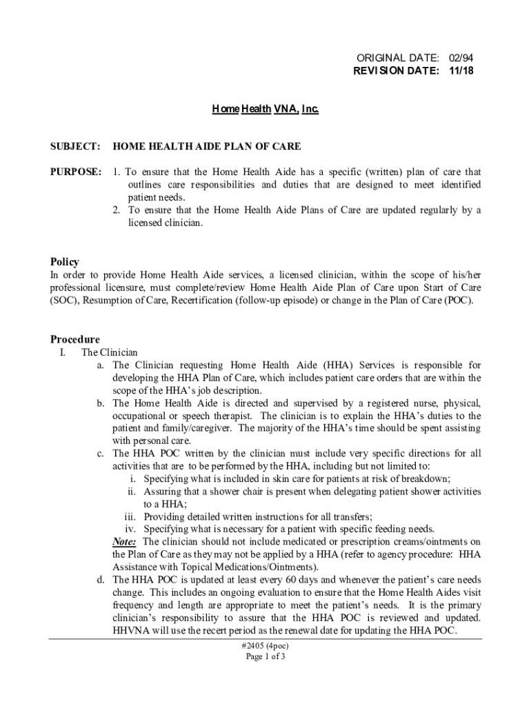 ORIGINAL DATE: 02/94 REV SI ON DATE: 11/18 Home Health VIA, I NC. SUBJECT:HOME HEALTH AIDE PLAN OF REPURPOSE:1. To ensure that the Home Health Aide has a specific (written) plan of care that outlines