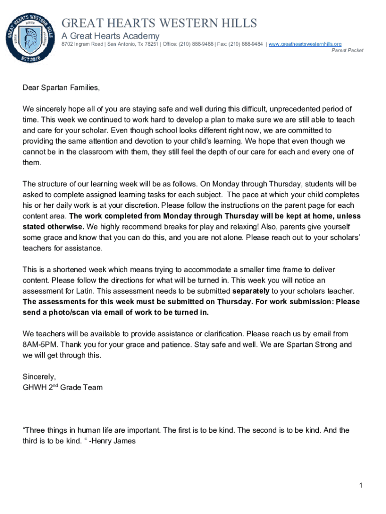 GREAT HEARTS WESTERN HILLS A Great Hearts Academy 8702 Ingram Road | San Antonio, TX 78251 | Office: (210) 8889488 | Fax: (210) 8889484 | www.greatheartswesternhills.org Parent Packet Dear Spartan