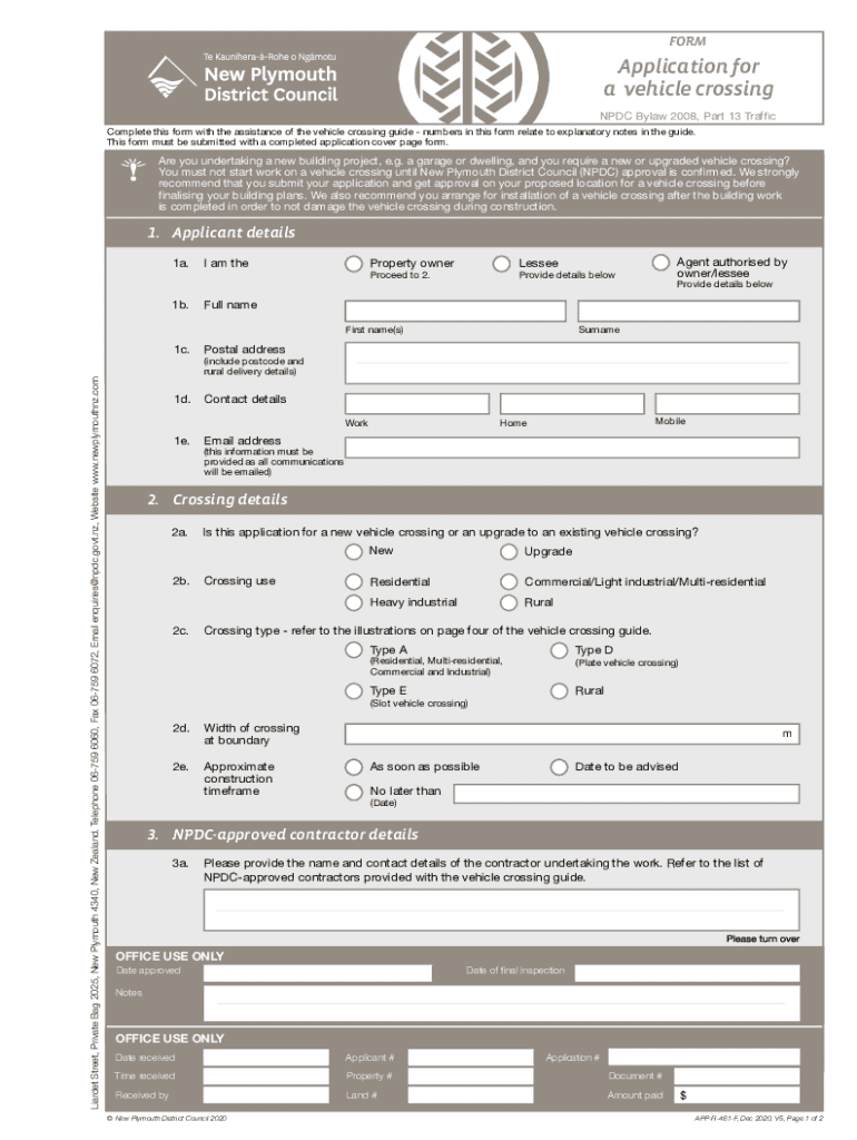 Formalization for a vehicle crossing NPC Bylaw 2008, Part 13 Traffic Complete this form with the assistance of the vehicle crossing guide numbers in this form relate to explanatory notes in the guide.